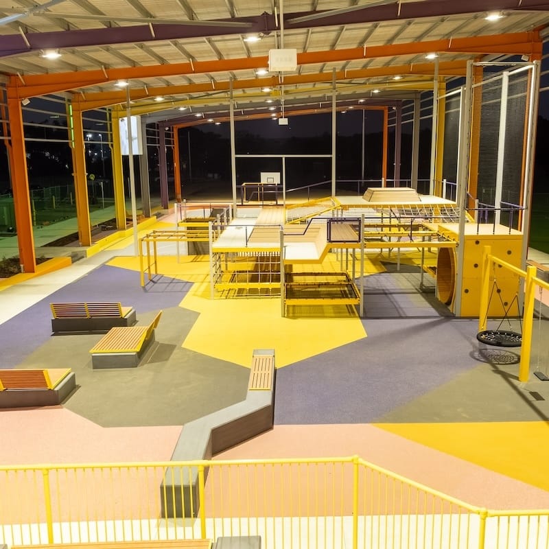 It features a split-level skate plaza, a shallow skate bowl for all skill levels, pump track, multipurpose sports court and rebound wall, plus urban play area with swings, hangout zone and seating.