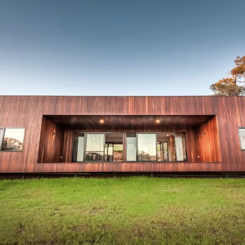 Freshwater House is a brand new house, architecturally designed with holiday rentals in mind. Set amidst acres of rolling pasture, it looks over a valley and a waterfall in Burnside, near Margaret River.