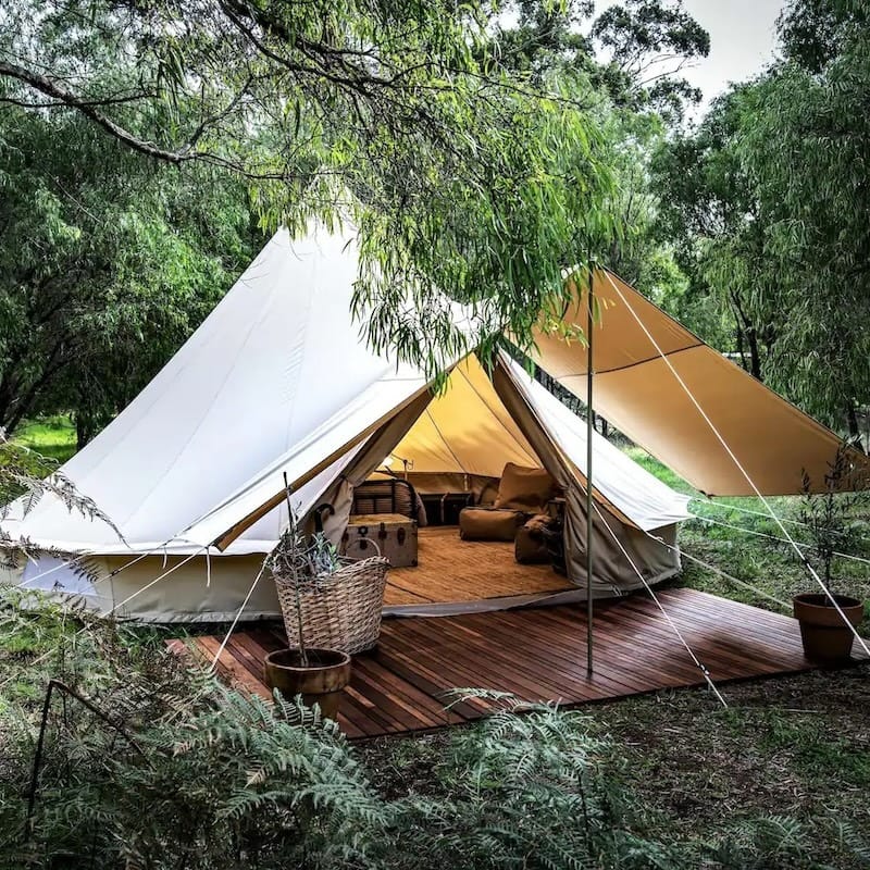 Welcome to what the owners call bush luxe: a breath-taking bell tent filled with sumptuous furnishings, books, artisanal cafe station and ephemera from a bygone era of travel.